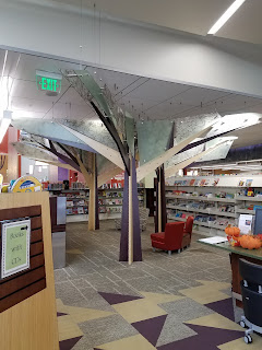 Second, the homeless population. Of all the places I've visited, the Salt Lake City Main Library had the largest contingent of homeless patrons. You have to remember just how large this library is--it is enormous. They hung out in the amphitheater, and those with carts had set up semi-permanent residences near the glass boxes in the tail of curve. Many others were inside, surrounded by bags, in reading chairs and at desks.